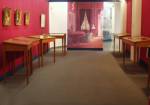 Mit Hilfe von mit Stoff und mit Großdrucken bespannten Rahmen entsteht ein Raum, der eine Salon-Atmosphäre erzeugt. Die sehr kühlen Ausstellungsräume wirken so intimer und bietet den Rahmen für die feinen und empfindlichen grafischen Objekte.